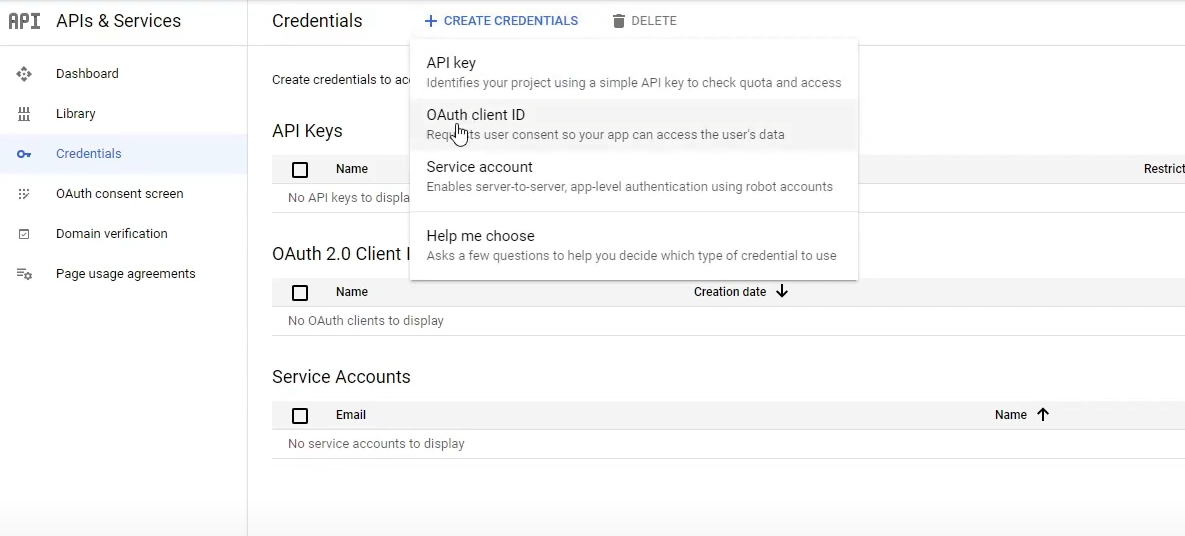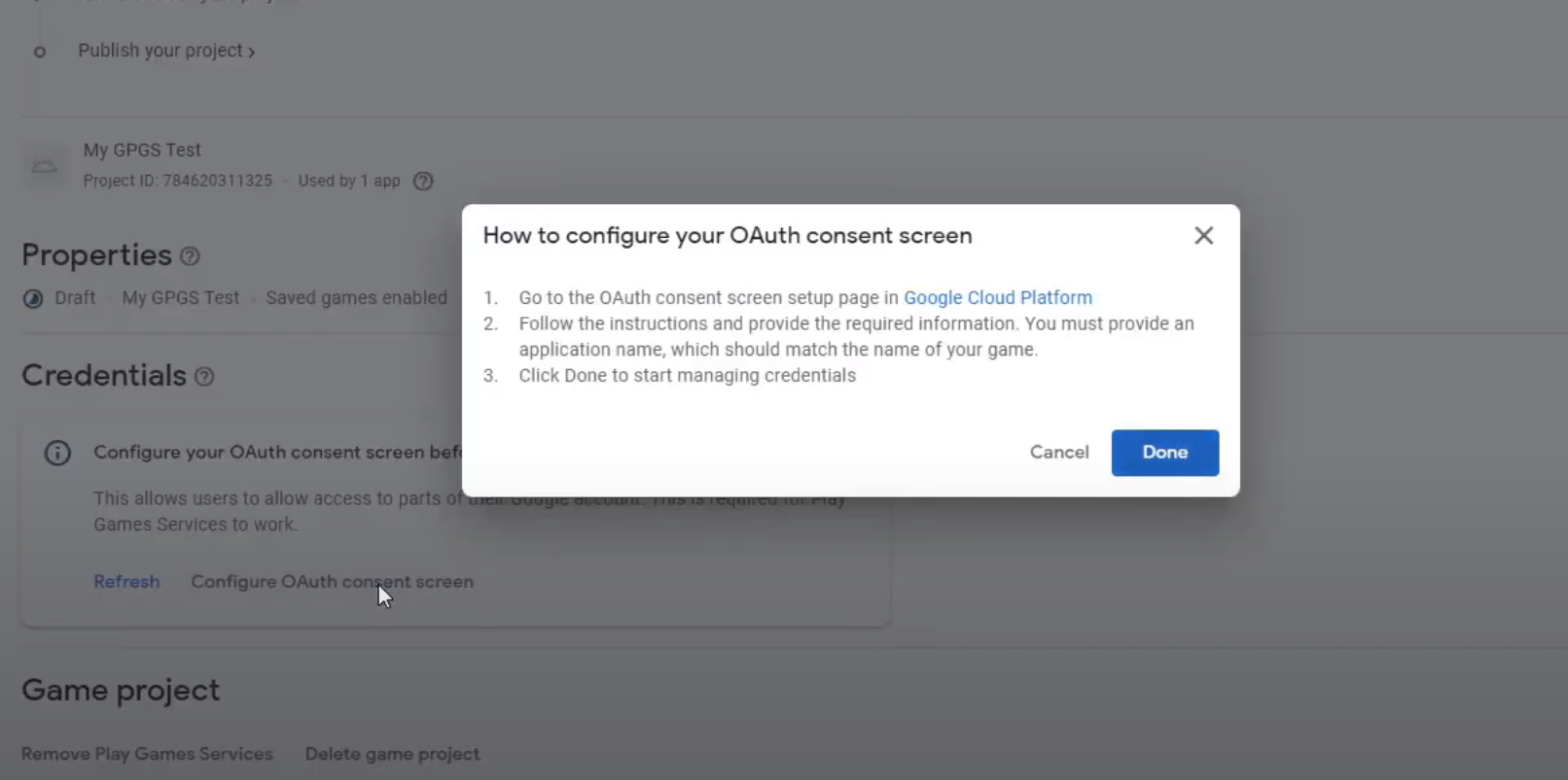 It will ask if your game already uses Google APIs, of course, doesn’t yet, fill in the name and create. Now we will be able to have our project ID and credentials to configure our OAuth consent inside GCP.