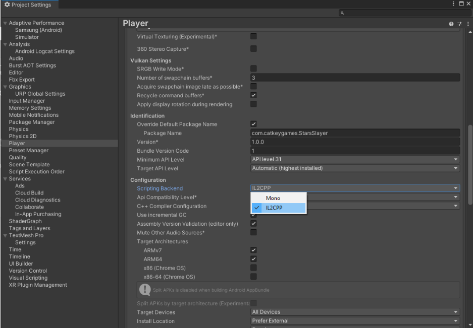 Finally, the scripting backend field needs to be changed to IL2CPP instead of mono. There are a number of trade-offs in both options. The two scripting backends are different your choice depends on your use case. In our context, it will allow also us to change the target architecture to ARM64. This is quite important because you can’t publish any app if doesn’t support ARM64.