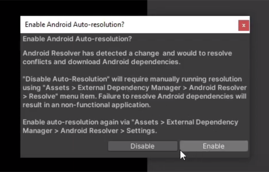 Click on "enable," and the necessary dependencies for establishing a connection with GPGS will be automatically imported. Occasionally, you may encounter a situation where the Android Resolver fails during the initial attempt. However, there's no need to worry as this issue tends to resolve itself later on.