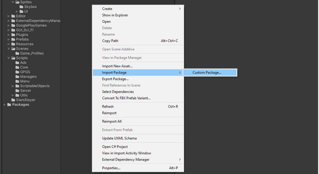 Right-click in the project window → Import Package → Custom package → Select the package. (You can also drag and drop the file into the project window)