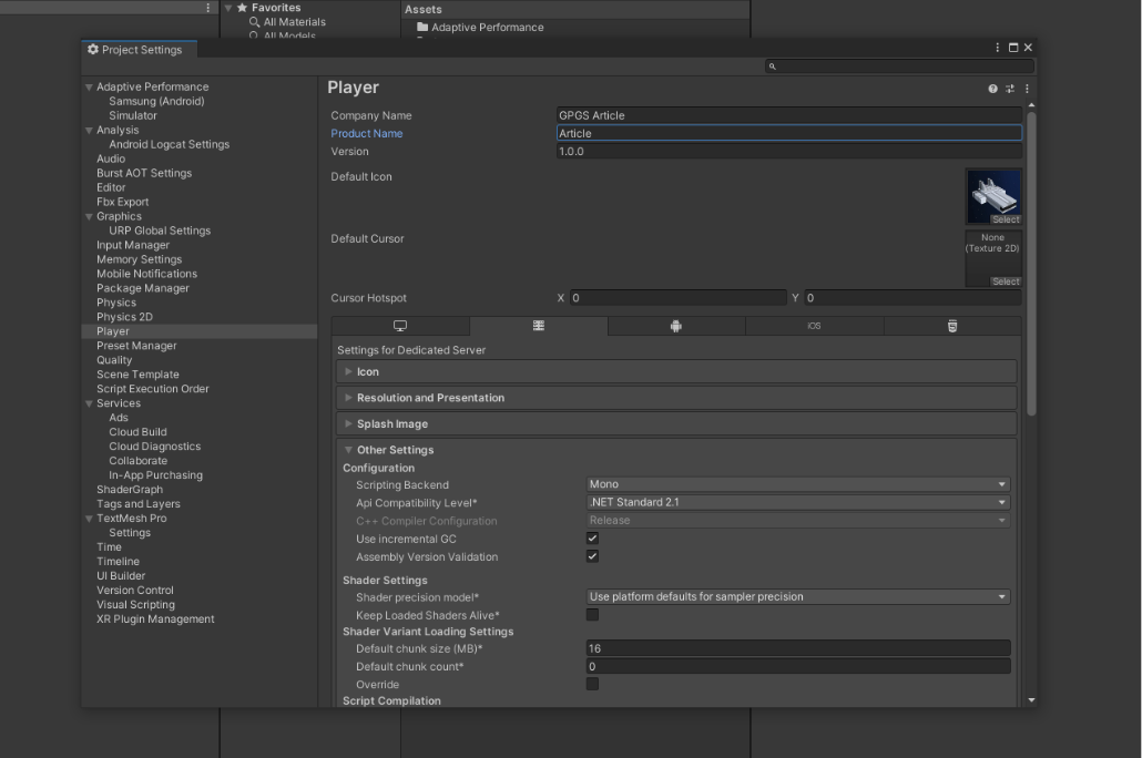 Now it’s time to configure our Unity project settings. Inside the player settings, we will change the default names of the company (you can name it whatever you want, that’s fine).