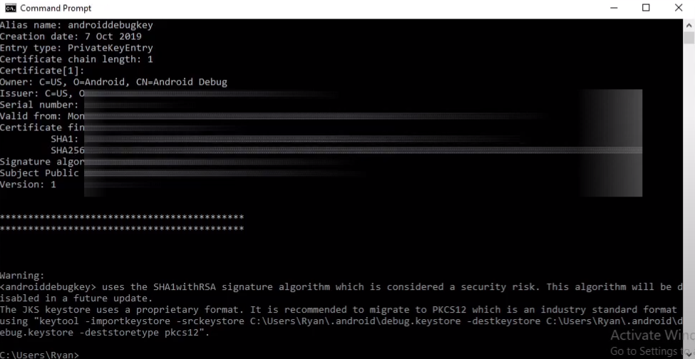 -keystore C:\Users\Username\.android\debug.keystore -list -v