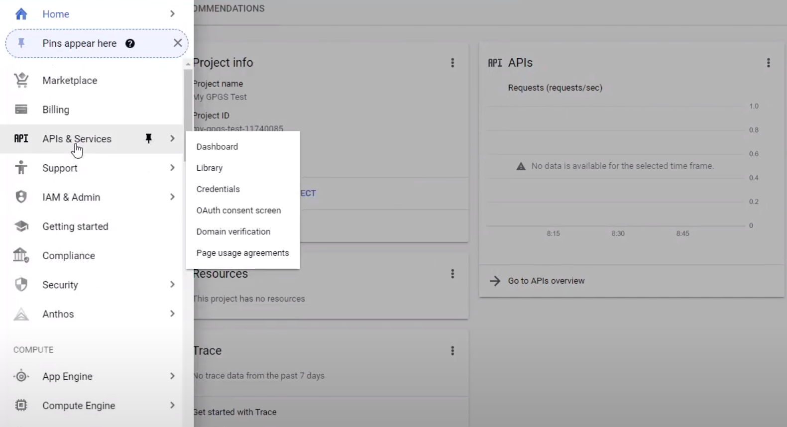 Once you have selected the project there’s quite a lot of information there but we don’t really need any of this stuff. The only thing we need is the section found in the section menu APIs & Services.