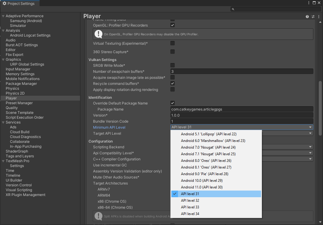 The next thing we need to change it’s the minimum API Level to +31. If you have an old device you won’t be able to install the APK so be aware of this field. Currently API level +31 it’s the lower API level needed to publish an app on the play store.